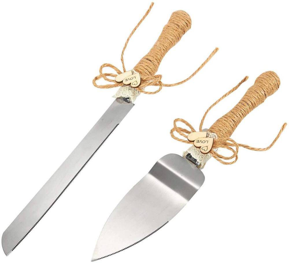 El cuchillo y la pala vienen decorados con tela yute un lacito y dos corazón de madera.